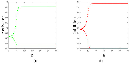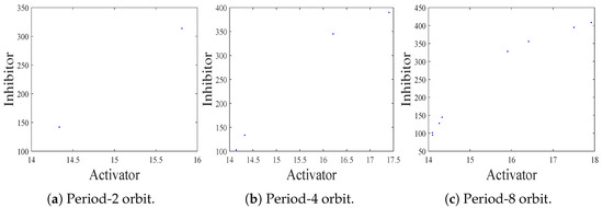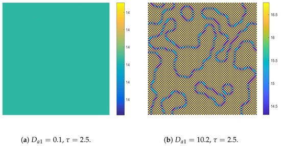 ; it means that the CML model can experience both flip bifurcation and Turing bifurcation. The corresponding Turing patterns are shown in Figure 14b. Similarly, the patterns consist of two alternative states, namely, the period-2 orbit bifurcated from the fixed point via flip bifurcation. Furthermore, let