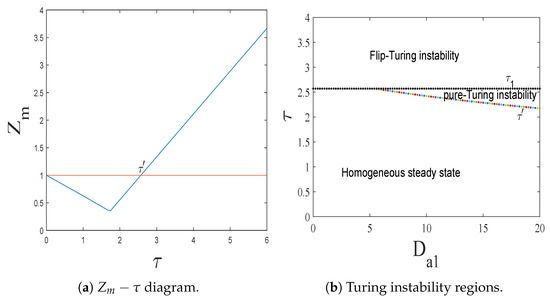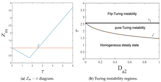 indicates the parameters set. In 1952, Turing built on this reaction–diffusion theory to explain how, in the absence of genetic differences, biological forms can produce spatial patterns through chemical reactions and diffusion processes [2]. These spatial patterns are produced because of the unequal spatial diffusions. Therefore, this destabilization is called spatial-driven instability, and the resulting patterns are called Turing patterns. Turing’s pioneering works later opened up a whole new field of research. But initially, his seminal works did not attract much attention from scholars until 1972 when Gierer and Meinhardt became acquainted with Turing’s theory. In [3], Gierer and Meinhardt proposed several molecular models in the form of reaction–diffusion equations to explain the formation of a spatial pattern of tissue structures in embryology and regeneration, which include the depletion model, activator–inhibitor model with common sources, and activator–inhibitor model with different sources. They found that stationary patterns can emerge in certain chemical systems consisting of activators and inhibitors. Their findings exactly confirmed Turing’s theory. Thus, the 1970s marked the onset of an increasing fascination with Turing patterns, a trend that continues to this day [4].