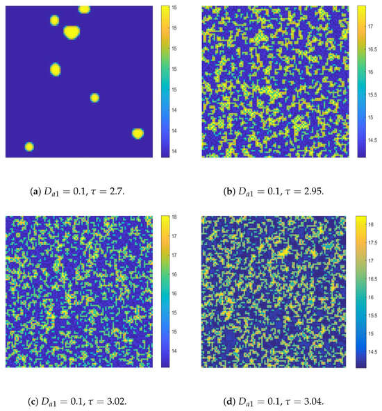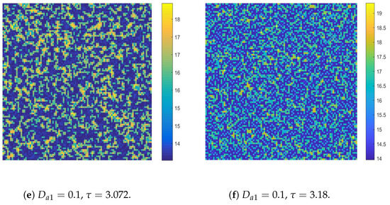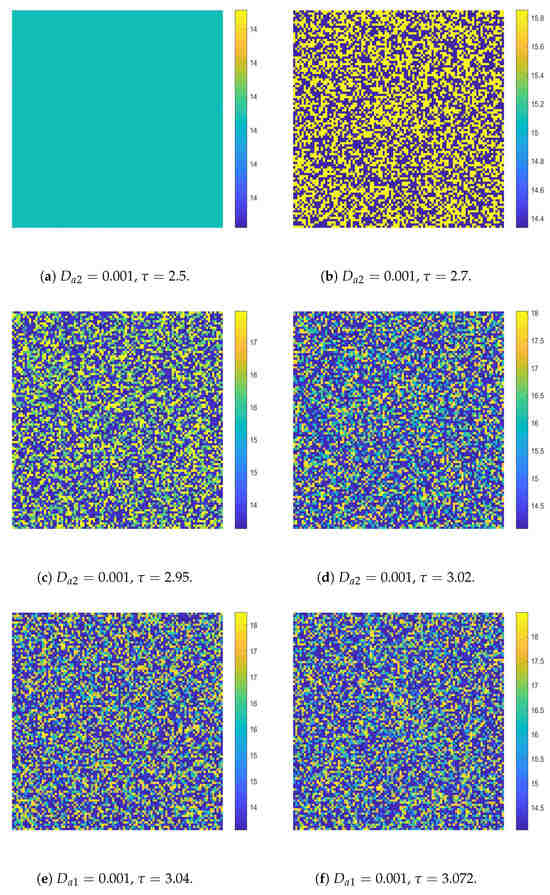 Finally, we will illustrate the Turing patterns induced by the pure-self-diffusion-Turing instability mechanism. We assume that cross-diffusion acts first in the system. But cross-diffusion does not cause Turing instability. The values of the parameters are the same as in the simulations depicted in Figure 14a. Then self-diffusion terms are added to the system, namely,