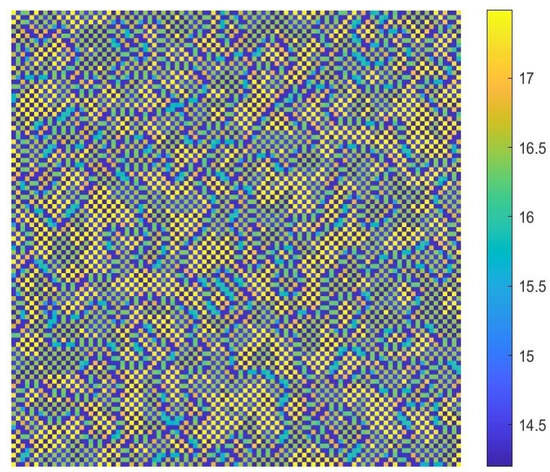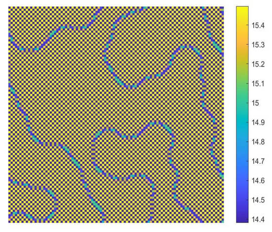 ; according to Figure 13b, we know that the CML model will only undergo a Turing bifurcation. The patterns are shown in Figure 15, and the corresponding mechanism is called the pure-cross-diffusion Turing instability mechanism. From Figure 15, we can also see a colorful mottled grid pattern with winding and twisted bands.