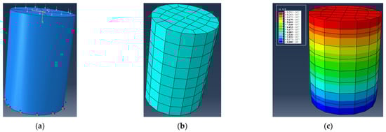 Finite element calculation model of a cylinder: (a) loads and constraints; (b) meshing; (c) calculation result.