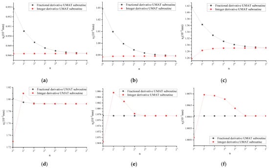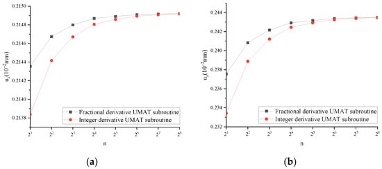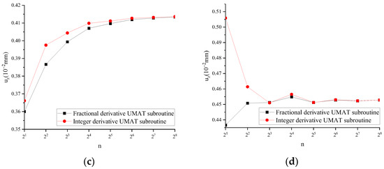 When the fractional derivative UMAT subroutine (FUMAT) α = 1, the calculated results are mutually verified with the integer order UMAT subroutine (IUMAT). Taking uz as an example, the results are shown in Figure 4.