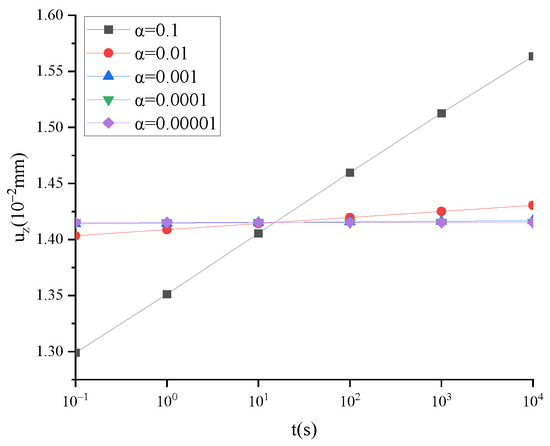 From the definition of the fractional derivative, α cannot be equal to 0. When α tends to 0, taking uz as an example, the calculation results of the fractional derivative viscoelastic and elastic models are shown in Figure 5, and the time step h = 0.01 t is taken. When α = 0, the fractional derivative viscoelastic model degenerates into a linear elasticity model with an elastic modulus of 1040 MPa and Poisson’s ratio of 0.3. In this case, uz = 0.0141523 mm.