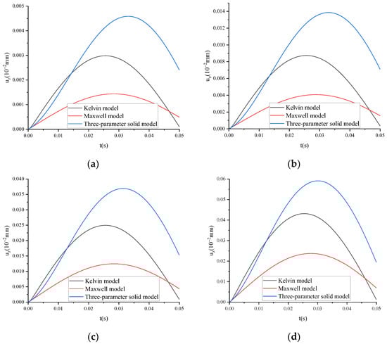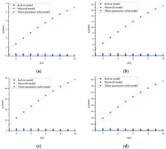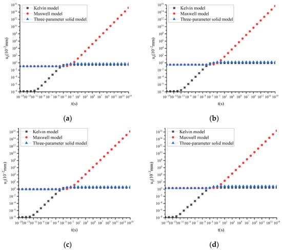 Figure 6 shows that for the Maxwell model, uz tends to infinity as time increases, resulting in distortion. For the classic Kelvin model, when the calculation time is minimal, uz is much smaller than the calculation results of the other two models. Through the comparison of calculation results, it was found that a three-parameter solid model can better describe uz.