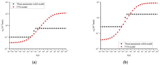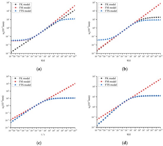 (2) FK and Kelvin models are fundamentally solid, which may introduce inaccurate calculation results when the computation time is short. Similarly, the FM and Maxwell models are essentially liquid models, which can also lead to distortions in calculation results when the computation time is extended. FTS possesses the combined advantages of FK and FM, enabling an accurate depiction of material viscoelastic characteristics across a broad time spectrum.