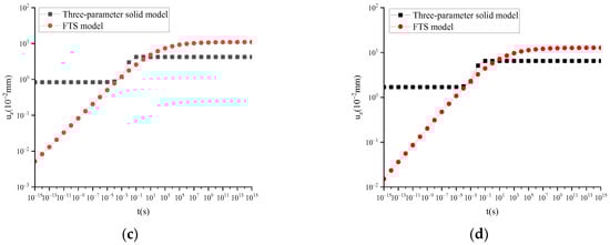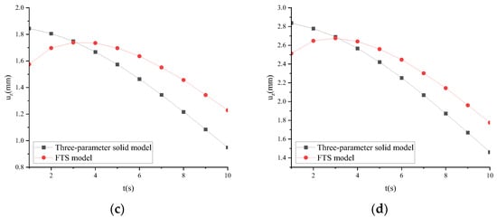uz of the three-parameter solid model and FTS under static load and different temperatures: (a) T = 15 °C; (b) T = 30 °C; (c) T = 45 °C; (d) T = 60 °C.