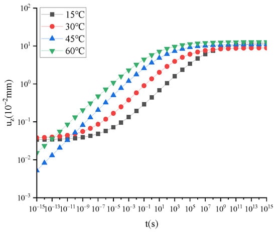 The uz increases with temperature in the time interval of 10−10~108 s, as depicted in Figure 9. This observation aligns with the general characteristics of viscoelastic materials, where material stiffness decreases with increasing temperature. However, for t ≤ 10−11 s or t ≥ 109 s, a further increase in temperature no longer leads to an increase in uz. These findings indicate that while FTS provides a better description of viscoelastic properties in rubber-modified asphalt mixtures, subtle differences between this model and the actual constitutive behavior still exist, rendering its application limited across all time domains. Inaccurate results are obtained when calculating extremely small or large timescales.