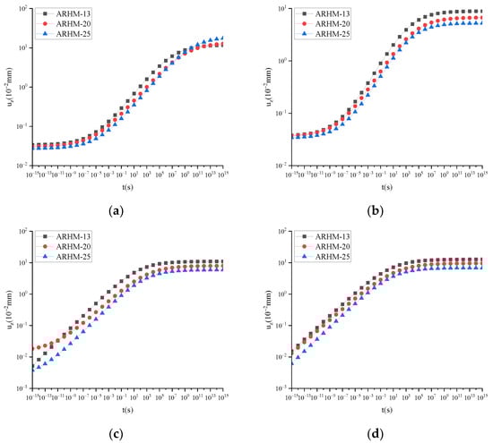 The results depicted in Figure 10 demonstrate that within 10−15 s~1015 s, when the temperature reaches or exceeds 30 °C, uz follows a trend of ARHM-25 > ARHM-20 > ARHM-13 as time progresses. Considering the specific applicability range of FTS in the time domain, during the time interval of 10−10~108 s and under all four temperatures, an increasing temporal trend is observed for uz with ARHM-25 > ARHM-20 > ARHM-13.