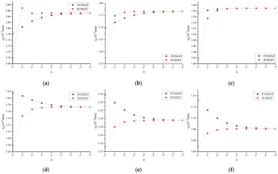 Assuming n1 = 1 and n2 = 1, the vertical displacement of the center of the upper surface of the specimen (uz) in different schedules is calculated. The calculation results are shown in Figure A1. The longitudinal coordinates are of uniform length, the total length is 0.4 × 10−2 mm, and the scale is 0.05 × 10−2 mm. As can be seen from Figure A1, when t = 1 s and α = 0.9, it is the most unfavorable state of convergence, and h = t/32 can meet the convergence of two decimal places. Assume n1 = 1 and t = 1 s, and calculate uz different n2 values. The calculation results are shown in Figure A2. The longitudinal coordinates are of uniform length, the total length is 0.12 × 10−2 mm, and the scale is 0.02 × 10−2 mm. Figure A2 shows that when n2 = 1 and α = 0.9, it is the most unfavorable state for convergence, and h = t/32 can satisfy convergence to two decimal places. Assuming that n2 = 1 and t = 1 s, uz is calculated under different values of n1. The calculation results are shown in Figure A3. The vertical coordinates are of uniform length, the total length is 0.15 × 10−2 mm, and the scale is 0.05 × 10−2 mm. From Figure A3, it can be seen that the value of n1 has almost no effect on convergence. According to the above convergence analysis and calculation results, when t = 1 s and n2 = 1, it is the most unfavorable convergence state, and the larger the α value, the more damaging the convergence. When α = 0.9 and h = t/32, it can meet the intersection after two decimal places. Therefore, when h ≤ t/32 is used for calculating under static load, the results converge when α ≤ 0.9 and other parameters are arbitrary.