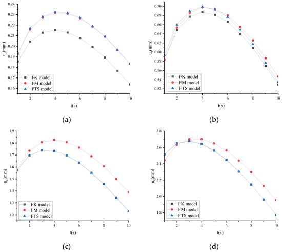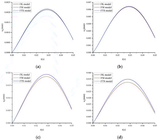 Figure 7 shows that uz tends to infinity for the FM as time increases, resulting in distortion. For the FK, when the calculation time is minimal, uz tends to be 0. Through the comparison of calculation results, it was found that FTS can better describe uz.