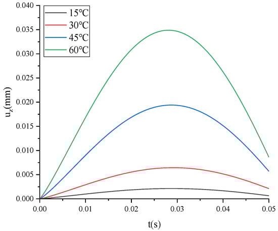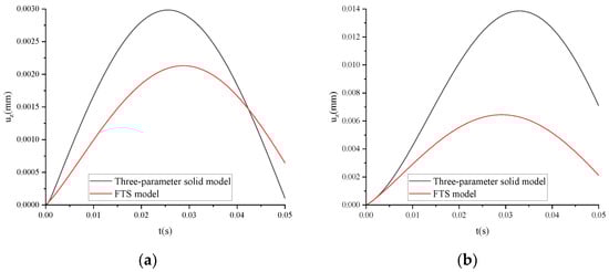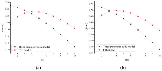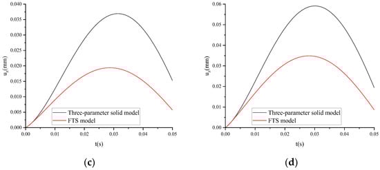 Taking ARHM-13 as an example, the mechanical response of the three-parameter solid model and FTS is calculated, and the incremental step h is t/50. The uz of the three-parameter solid model and FTS under different temperatures is shown in Figure 8.