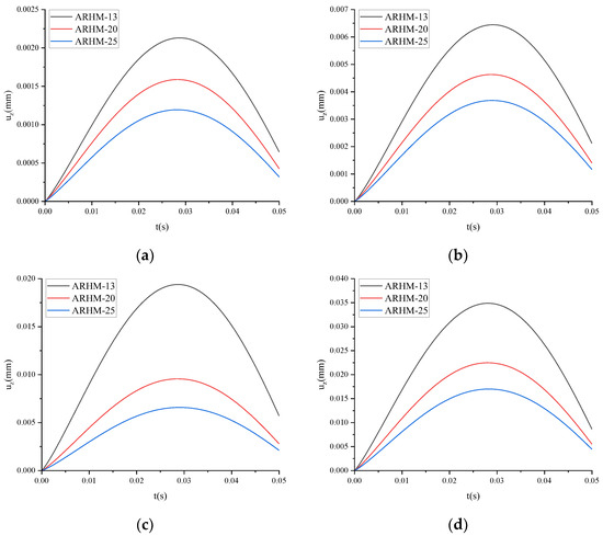 Taking ARHM-13 as an example, the mechanical response of several fractional derivative viscoelastic models is calculated, and the incremental step h is t/50. The uz of several fractional derivative viscoelastic models under different temperatures is shown in Figure 7.