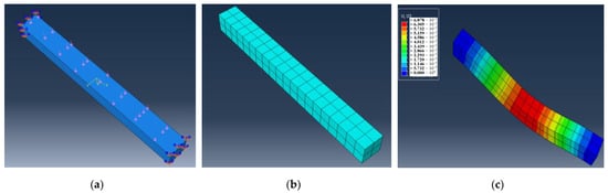 Finite element calculation model of a beam: (a) loads and constraints; (b) meshing; (c) calculation result.