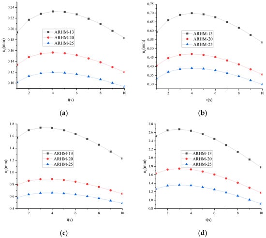 As can be seen from Figure 24, the vertical displacement in the middle of the beam span is as follows: ARHM-13 > ARHM-20 > ARHM-25. The maximum time of vertical displacement is about 4 s.