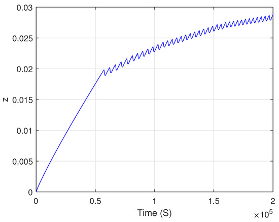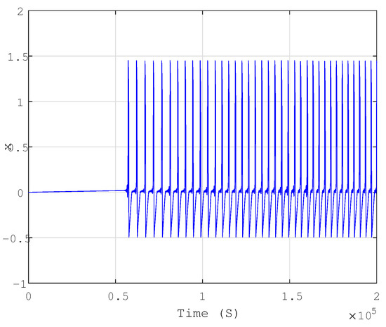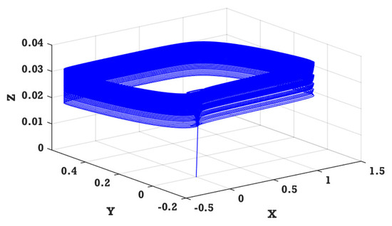 Table 1 presents the parameters used in the transmitter system, with the state variables’ initial conditions set at zero. Figure 1, Figure 2 and Figure 3 illustrate the time responses of the system’s states , and Figure 4 illustrates the three-dimensional space of the chaotic attractor in .