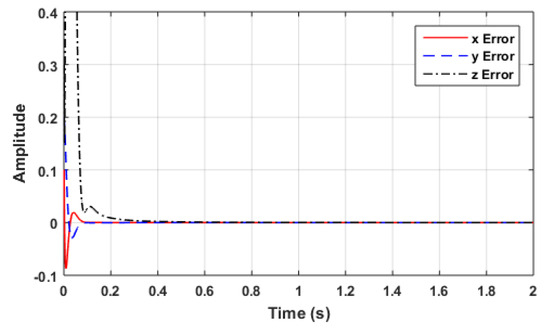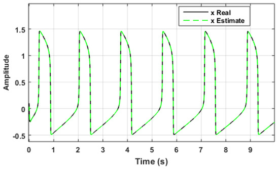 Figure 9, Figure 10 and Figure 11 show the responses of the states and their estimations . Figure 12 shows the collective estimation errors for the three state variables. This proves that the two FOCS can be synchronised optimally within a finite amount of time. The initial conditions are assumed to be , whereas the responding system’s initial conditions are all set to zero .