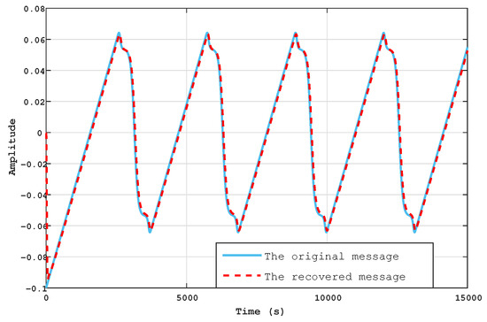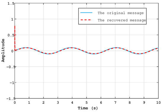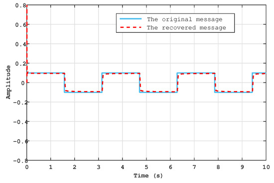 The original message and the recovered with initial conditions and . The orders for the transmitter are , whereas those for the receiver are set to .