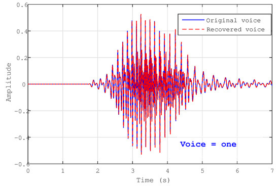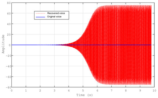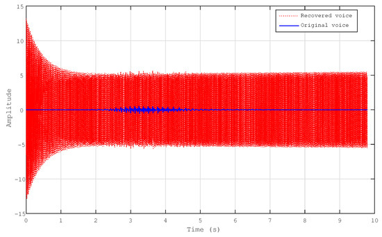 The original message voice and the recovered with initial conditions , and . The order for both the transmitter and receiver is .
