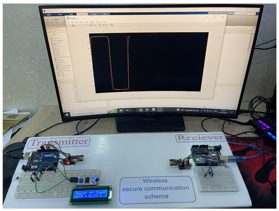Figure 19 shows the experimental validation of the proposed secure communication scheme. We implemented the FOCS and SBS-SMO in the two microcomputers in the transmitter and the receiver, respectively. The discrepancy between the theoretical and the experimental aspects has been minimised through mathematical tools such as Rung Kutta 4, approximation between fractional and integer transfer functions, and the Kalman filter. Wireless transmission was facilitated by the NRF24L01 module. The obtained results confirm the validity of the proposed idea from both mathematical and numerical aspects and its readiness for application in the experimental field.