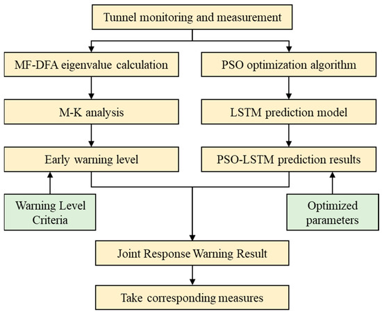 First, tunnel deformation monitoring and measurement are conducted to obtain tunnel deformation data. Second, the monitoring data are segmented into 12 groups, and multifractal eigenvalues are calculated and analyzed using the M–K method. The warning level is then determined in conjunction with the warning level criteria. Third, the parameters of the LSTM prediction model are optimized using the PSO optimization algorithm, and the PSO-LSTM prediction model is formulated for predicting tunnel settlement. Fourth, the warning level and prediction results are jointly analyzed to obtain the warning outcomes. Finally, corresponding preventive measures are implemented based on the results of the warning level.