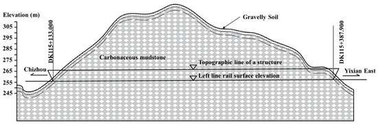 The tunnel is situated in the low hills, originating from Huangshan Mountain. It is characterized by undulating terrain with mountain elevations ranging from 250 m to 325 m and a maximum elevation difference of approximately 75 m. The mountain exhibits a monoclinic structure, with steeper south and north slopes. The tunnel primarily traverses carbonaceous mudstone of the Cambrian Hotang formation, with a maximum tunnel depth of about 65 m. (Refer to Figure 2 for a visualization of the tunnel cross-section.)