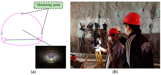 Tunnel deformation monitoring and measurement: (a) tunnel monitoring point layout, (b) manual monitoring and measurement.