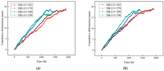 Tunnel cumulative deformation–time diagrams: (a) tunnel cumulative settlement–time diagram, (b) tunnel cumulative convergence–time diagram.