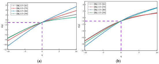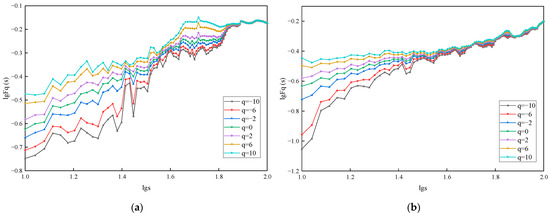 In order to effectively use multiple fractal theory to analyze the fractal characteristics of the tunnel displacement deformation rate, a double logarithmic scatterplot of is plotted by varying the fluctuation order ( ∈ [−10, 10]). Least squares fitting was used with the slope of the generalized Hurst exponent . Taking a set of multifractal features of tunnel settlement deformation rate and tunnel convergence deformation rate as an example, Figure 6 shows the trend of the q-order fluctuation function through double logarithmic fitting.