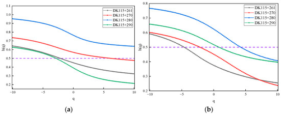 According to the settings of the above parameters, the data series for tunnel settlement deformation rate and tunnel convergence deformation rate were subjected to multifractals using MATLAB software (R2018b), respectively. The variation of the generalized Hurst index of the tunnel deformation rate data series is shown in Figure 7. The variation of the scalar function of the tunnel deformation rate data series is shown in Figure 8. The multifractal spectrum of the tunnel deformation rate data series is shown in Figure 9.