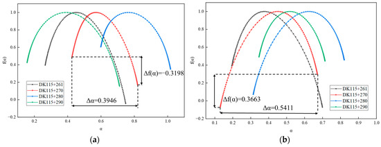 In tunnel construction, the control of tunnel deformation stands out as pivotal technology [9]. Consequently, the monitoring and stability evaluation of tunnel deformation are paramount. Current methods for deformation monitoring and analysis encompass numerical simulation methods [10,11,12,13], time series analysis methods [14,15,16,17], fuzzy comprehensive evaluation methods [18,19,20,21], and machine learning methods [22,23,24,25]. Yet, the complexity of the geological environment and deformation-inducing factors introduce a nonlinear characteristic to the tunnel deformation monitoring time-course curve, causing fluctuations [26]. Therefore, the multifractal detrended fluctuation analysis (MF-DFA) method presents an effective approach for tunnel deformation analysis.