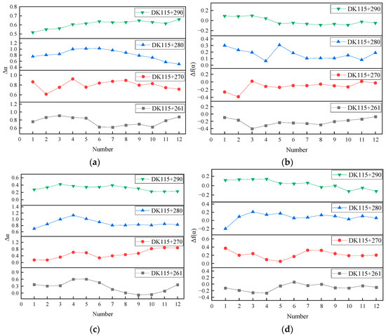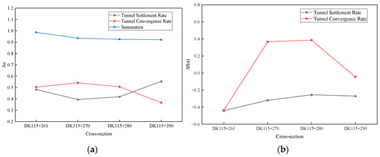 - From the standard deviation: The standard deviation values of the tunnel deformation rate at each cross-section are close. In the deformation rate of tunnel settlement, the standard deviation at DK115 + 280 is the largest, which can be visualized in Figure 2a. In the deformation rate of tunnel convergence, the standard deviation at DK115 + 270 is the largest, which can be visualized in Figure 2b. The standard deviations are all close to or greater than the mean, indicating a greater degree of dispersion in the data.