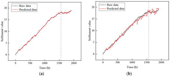 Tunnel settlement prediction results for different prediction models: (a) PSO-LSTM prediction results; (b) BP-ANN prediction results.