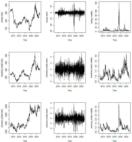 On the other side, volatility series are constructed by estimating the standard GARCH (1,1) model for the series. We estimate volatilities with a stochastic volatility model due to the heteroscedastic structure of the return series. In the GARCH (1,1) model presented in Equation (2), stands for the conditional variance of asset i at time t, is the model constant, and is the innovation of the series i at time t. Lastly, captures the short-term effects of shocks, while measures long-term persistency in volatility.