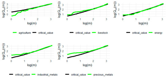 Before proceeding with multifractal analysis, we first test whether the cross-correlations are significant by using Podobnik and Stanley’s [28] test statistic. The test results are given in Figure 2 for return pairs and Figure 3 for volatility pairs, for and at the 95% confidence interval. The test statistics exceed the critical value for all time periods for volatility pairs. For the return series, the test values exceed the critical value for most of the sample period. In general, the results show that both return and volatility pairs of green bonds and commodities have significant cross-correlation.