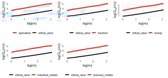 In this part of the article, we present findings on the multifractal detrended cross-correlation between green bonds and commodities and discuss the results accordingly. For the MFDCCA method, we need to specify some parameters. We choose q such that and set the time scale as . The minimum value of time scale s is set to 10 to avoid incorrect results in polynomial fitting on local trends for [64,65]. For the upper bound on s, we set the maximum value as N/2 to showcase very long-range cross-correlation in the series. Following the recommendation of Ferreira et al. [66] and Saâdaoui [67], we fix the maximum time scale as N/2 to fit robust scaling exponents and highlight long-range interconnectivity between green bonds and commodity markets.