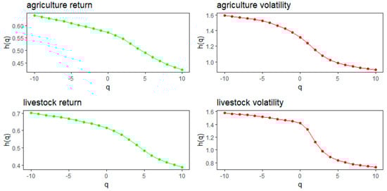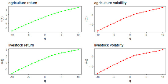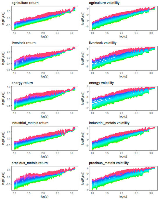 From now on, we direct our focus toward the multifractality of the relationship. In Figure 4, we draw the log–log plot of fluctuation function versus time scale s. As shown in Figure 4, the fluctuation functions of return and volatility pairs are increasing with s, which indicates a power-law relationship in all groups. The result shows the existence of long-range cross-correlation between the green bond market and the commodity market and the existence of multifractality of cross-correlations for both the first and second moments.