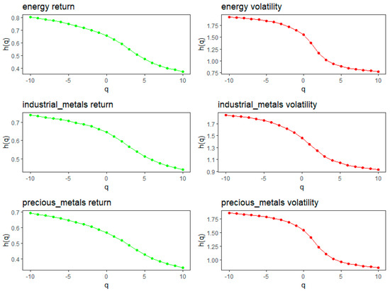 The slope of the log–log plots in Figure 4 shows the generalised Hurst exponent (scaling exponent) for various q orders. We obtain the scaling exponent and present the results in Figure 5. We check the Hurst exponent to identify whether the cross-correlations are random walk or they have multifractal structures. The empirical findings show that for all return and volatility pairs, which implies that cross-correlation of the green bond market and the commodity market is not random walk. In addition, the cross-correlation of the markets has multifractal features. Further, we investigate the direction of multifractal cross-correlations with the Hurst exponent at . Both return and volatility pairs have , indicating the long-range persistent cross-correlation. In a general perspective, is the strongest between green bonds and energy/industrial metal markets for the first moment series. On the other hand, it is the strongest among green bonds–industrial metals and green bonds–precious metals pairs at the second moment of the data. Furthermore, we can check how the cross-correlation dynamics occur under small and large fluctuations in the markets. For this aim, we check for small fluctuations and for large fluctuations.