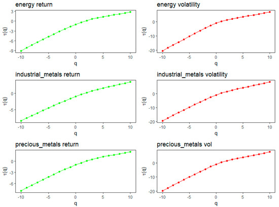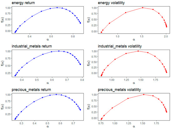 The Renyi exponent is supposed to nonlinearly increase with q in the case of multifractality. As can be seen in Figure 6, of the return and volatility series of bivariate pairs is a nonlinear and increasing function of q, which indicates that the cross-correlations of green bonds and the commodity market have multifractal features with complex dynamics. Figure 7 presents the singularity strength and multifractal spectrum for all pairs. The multifractal spectra take concave form for all return and volatility pairs. So, we can further conclude that the cross-correlation between green bonds and commodity markets has multifractal features.