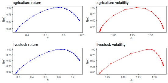 In the case of volatility pairs, the multifractality degree and the width of multifractal spectra significantly diminish after data transformation. Specifically, for agriculture, livestock, industrial, and precious metals series, it is observed that and . Conversely, for energy volatility series, the sequences and hold true. Thus, while both long memory and fat-tail distributions contribute to the multifractality of volatility series, the dominance of long memory is evident in agriculture, livestock, industrial, and precious metals, whereas fat tails play a more significant role in energy volatility.