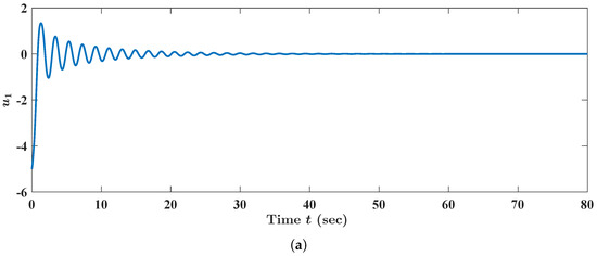 We visualize here the aforementioned Hopf bifurcation phenomenon in FBAMNN (124) (with ). For this purpose, we fixed , as well as numerically computed, based on MATLAB, the state trajectory of FBAMNN (124), which was supplemented by the initial condition