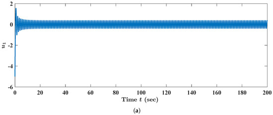 Numerical and graphical illustrations of the stability of the equilibrium states of FBAMNN (4), with and , which is viewed as the bifurcation parameter and is strictly less than a threshold constant. In addition, is the (unique) state trajectory triplet of FBAMNN (121), with (in actuality, ), which is strictly less than the threshold constant (namely the bifurcation point) . This is approximately equal to and , such that the initial Condition (123) is satisfied. Equivalently, it could be such that it holds that is for all , and that and are for all . The graph (curve) of the function is the first component of the aforementioned state trajectory triplet , , which is plotted in (a). The graph (curve) of the function , which is the second component of the aforementioned state trajectory triplet , , is plotted in (b). The graph (curve) of the function , which is the third component of the aforementioned state trajectory triplet , that is is plotted in (c).
