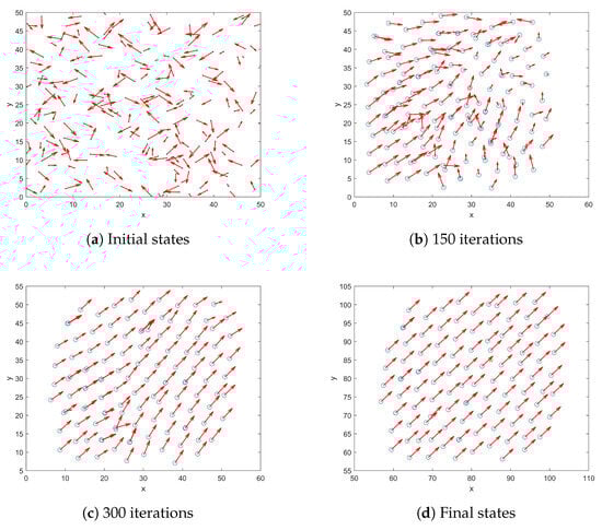Figure 3 illustrates the status of the multi-agent system based on our method at different time intervals. Figure 3a shows the initial states of the system, which are complete disorder. Figure 3b,c present the agents’ states after 150 and 300 iterations, respectively. Observably, with increasing iterations, the system transitions from disorder to order, and the speed of the agents gradually approach that of the virtual leader. The system’s final state is shown in Figure 3d, where all agents converge to a uniform state, exhibiting a lattice-like structure (verifying the first condition in Theorem 1).