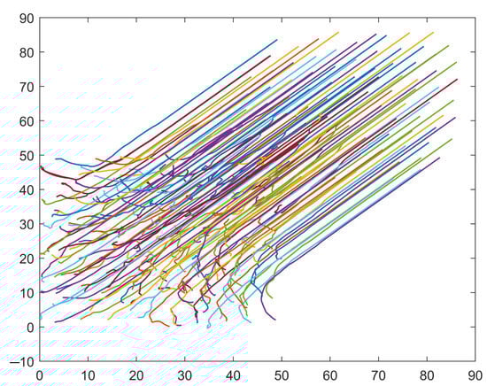 The motion trajectories of the agents are shown in Figure 4. It can be seen that, at first, the whole system is disordered. With an increase in iterations, the degree of order of the system is improved through interactions between agents; in the end, the system reaches convergence, and all the agents move towards the upper-right direction.