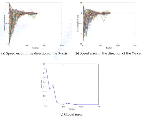 where and are the speed error in the direction of X-axis and Y-axis at time t, respectively. , and , are the speed components in the direction of X-axis and Y-axis at time t, respectively. Then, the global error between the agents and the virtual leader can be expressed as . The speed error between the agents and the virtual leader based on fractional-order flocking control is shown in Figure 5. Figure 5a is the speed error in the direction of the X-axis, and Figure 5b is the speed error in the direction of the Y-axis. Figure 5c shows the global error between the agents and the virtual leader. We can see that in the initial time, the speed error between the agents and the virtual leader is significant because the initial speed of the agents is random. Under the control of the fractional-order flocking algorithm, the agent’s speed gradually approaches the leader’s speed, and finally the speed error tends to 0. At this time, the speed of the agents and the virtual leader is consistent (verifying the second condition in Theorem 1).