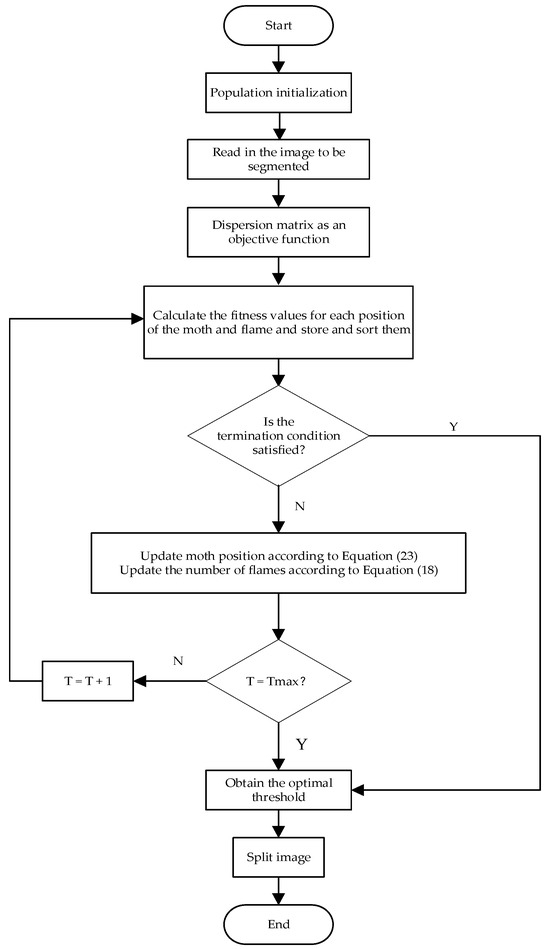 - Use the moth’s current position as a two-dimensional threshold vector to optimize, using Equation (7) as the objective function. The value of the objective function is used to generate moth locations as the initial populations. Then, the flame is assigned the moth’s spatial position after sorting it in the order of increasing value of the objective function. The flame’s initial position is determined by the optimal value, and the positions of the moth and the flame are saved and sorted.