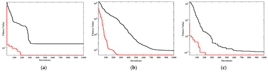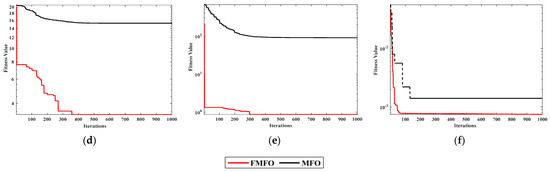 The convergence curves of the Schwefel 2.21 Function, Rosenbrock Function, Quartic Function, Ackley Function, Griewank Function, and Kowalik Function are shown in Figure 2. According to Figure 2a, the MFO algorithm tends to converge after 1000 iterations, while the FMFO algorithm converges at around 190 iterations. Figure 2b shows that the MFO algorithm converges slowly in the early stage and only starts to converge after 1000 iterations. Its ability to seek optimization is weak and the accuracy of its convergence is poor. In Figure 2c, it can be seen that the FMFO algorithm is closer to the theoretical optimum, but the MFO algorithm performs poorly in terms of both convergence accuracy and speed. In Figure 2d,e, the fitness curves of the MFO algorithm become parallel to the x-axis after 600 and 500 times, respectively. This indicates that the MFO algorithm is stuck in a local optimality and it is difficult for the algorithm to jump out of the local optimality at a later stage. The MFO algorithm’s optimization seeking performance is limited, it suffers from local convergence defects and performs poorly overall. From Figure 2f, it can be seen that FMFO converges earlier than MFO and is closer to the optimal value.