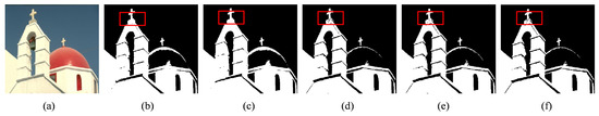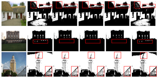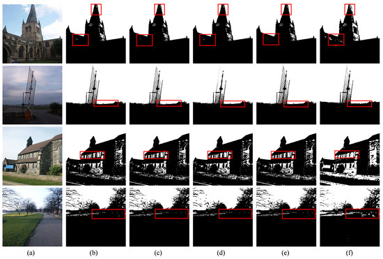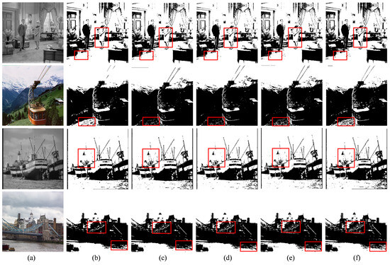 The segmentation results for the architectural images. In column (a) are the original images; (b–f) show the segmentation results of MFO-Otsu, FCS-Otsu, FPSO-Otsu, FFA-Otsu, and FMFO-Otsu, respectively. The partial differences in image segmentation results between the five algorithms are highlighted by red boxes.