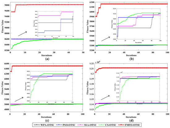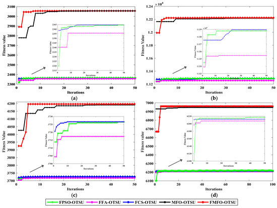 The objective evaluation index of the Couple image, the Cablecar image, the Boats image, and the Building image segmentation results are shown in Table 2, and Figure 4 indicates the fitness curve of them. For the segmentation results of the Couple image, MFO-Otsu finds the segmentation threshold in 31 iterations, FCS-Otsu reaches convergence at 14 iterations, FPSO-Otsu and FFA-Otsu both converge after 9 iterations, and FMFO-Otsu converges at 7 times. Therefore, FMFO-Otsu achieves maximum class spacing first, which means that FMFO-Otsu converges faster than other algorithms. In addition, FMFO-Otsu had the highest fitness value. The PSNR of FMFO-Otsu is higher than the other four algorithms. This shows that FMFO-Otsu is capable of enhancing the segmentation details of the image and ensuring noise immunity. Furthermore, FMFO-Otsu has a lower MSE than the other four algorithms, which suggests that its accuracy is more advantageous compared to the other algorithms.