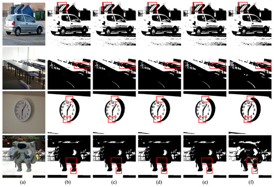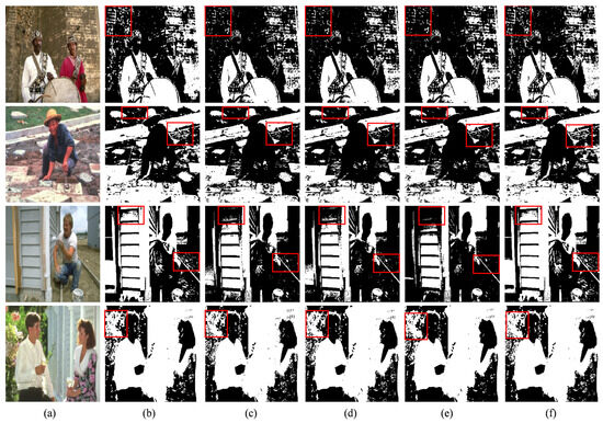 The segmentation results for the object images. Column (a) shows the original images; (b–f) show the segmentation results of CS-Otsu, SSA-Otsu, PSO-Otsu, WPA-Otsu, and FMFO-Otsu, respectively. The partial differences in image segmentation results between the five algorithms are highlighted by red boxes.