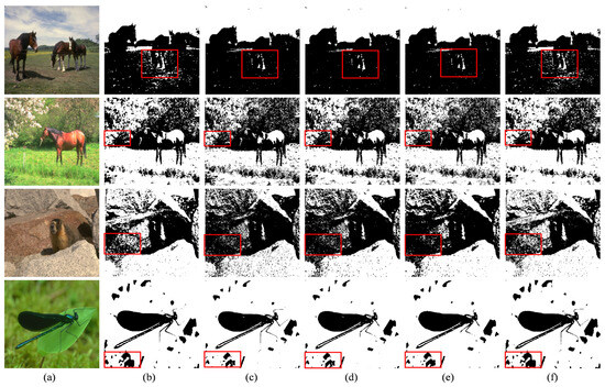 The segmentation results for the animal images. In the (a) column are the original images; (b–f) show the segmentation results of MFO-Otsu, FCS-Otsu, FPSO-Otsu, FFA-Otsu, and FMFO-Otsu, respectively. The partial differences in image segmentation results between the five algorithms are highlighted by red boxes.